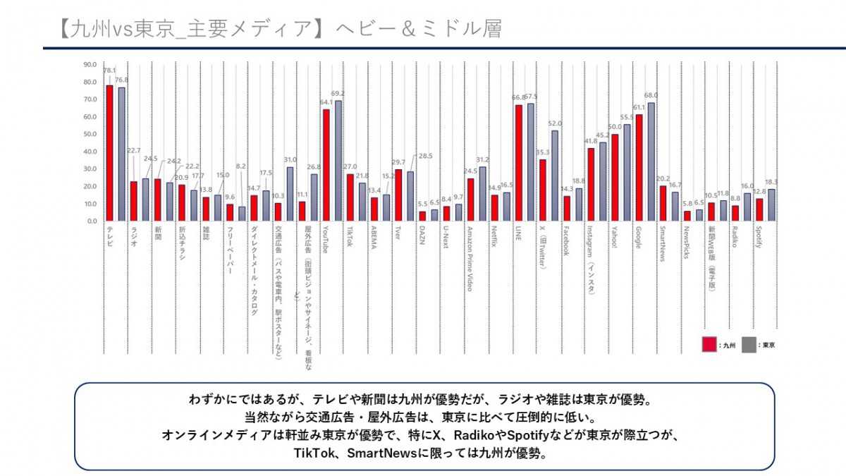 近藤:「X(前回調査時はTwitter)やradikoなど、自ら積極的に情報を取りに行く層が使うメディアは、首都圏の方が利用率が高い傾向にあります。九州内で見ると、福岡がもっとも高くなります。」
